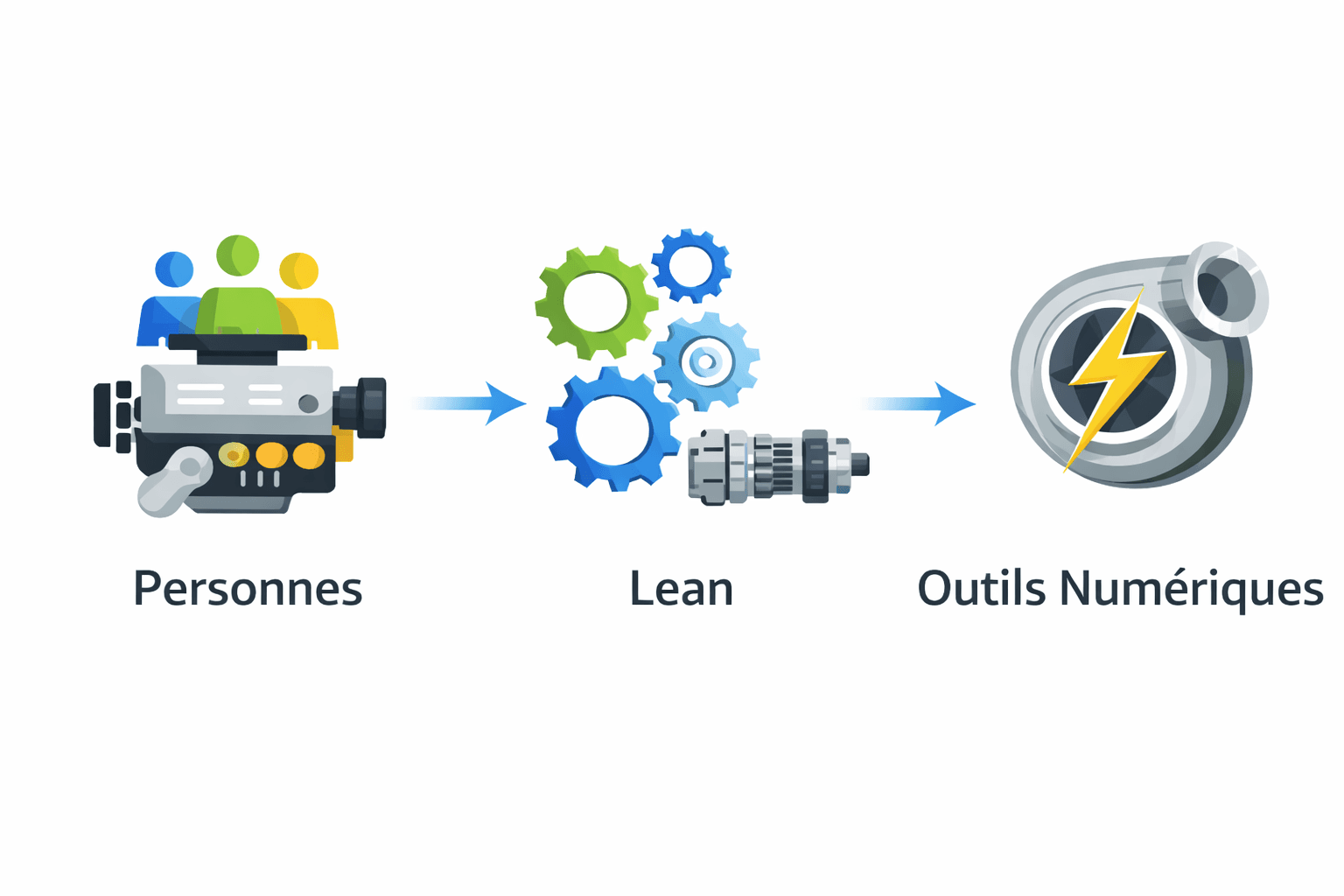 Les personnes sont le moteur qui fait avancer la voiture. Les principes Lean agissent comme la transmission et la direction, garantissant que la puissance est transférée efficacement sans gaspillage. Les outils numériques sont le turbocompresseur, permettant au véhicule de parcourir la même distance en un temps record.