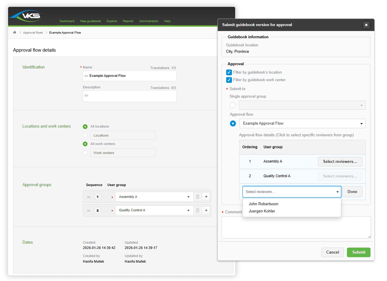 Avec la sortie de VKS 7.1, nous introduisons des améliorations ciblées dans le processus d'approbation. Cette mise à jour vise à améliorer les méthodes utilisées par les auteurs pour obtenir l'approbation des guides destinés à l'atelier. Elle offre un processus d'approbation plus efficace, plus flexible et plus personnalisable.